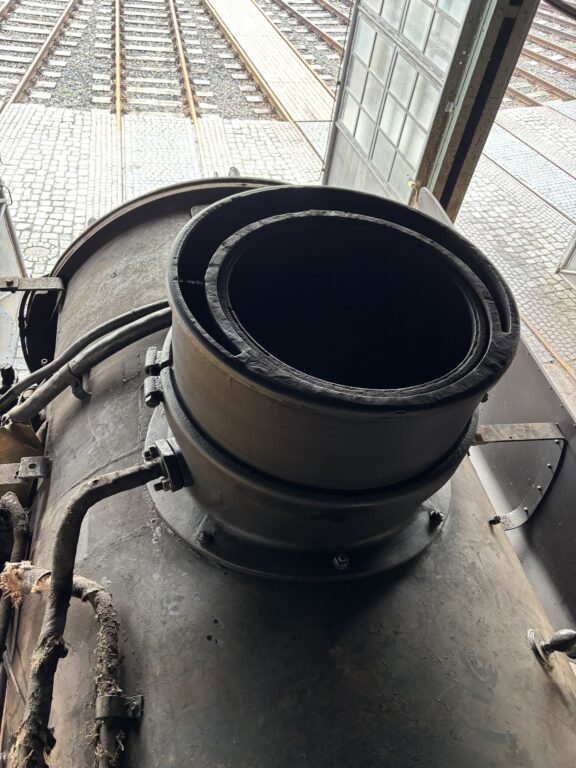 Der Schornstein wurde fertig aufgearbeitet, montiert, lackiert und hat seine Anbauteile wieder bekommen.