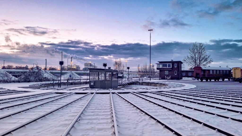 Das Bild des Monats Dezember wurde aus der Grube von Gleis 22 des Ringlokschuppens aufgenommen. Zu sehen ist unsere 042, wie sie auf Gleis 21 steht und durch die Glasscheiben der Tore guckt.